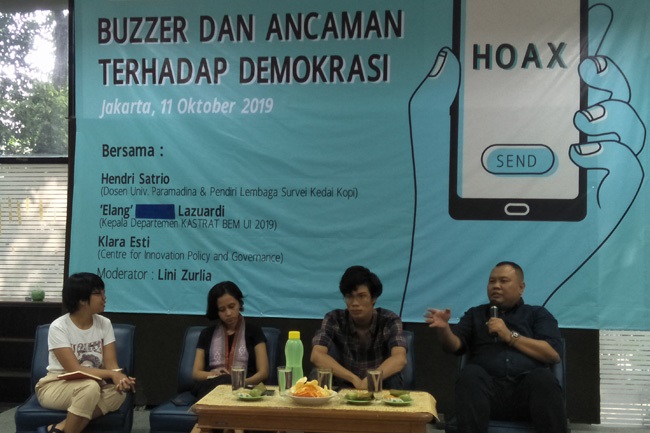 Soon after the controversial reform of the Corruption Eradication Commission (KPK) in September 2019, CSOs began scrutinising the role of buzzers in manipulating public debates on this issue. On 11 October 2019, activists organised a public discussion at the Jakarta office of the Indonesian Legal Aid Foundation (YLBHI), on ‘Buzzers and the Threat to Democracy’. One of the speakers, Hendri Satrio (founder of polling institute Kedai Kopi), pointed out that buzzers are difficult to curb because strictly speaking, they are exercising their citizen’s right to freedom of expression. Nonetheless, he added, pro-government buzzers also hinder the democratic process by drowning out public criticism, threatening and spreading disinformation about opponents.