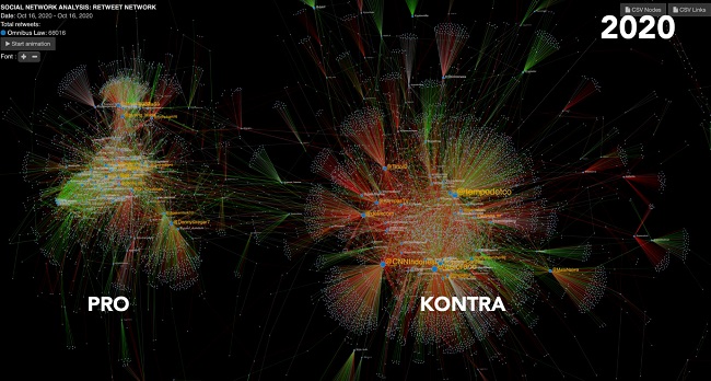 In addition to the sensationalist stories that media outlets publish on the shadowy but lucrative ‘business of buzzers’, citizens need more concrete, evidence-based information about the work of cyber troops. In that regard, important work is being carried out by Ismail Fahmi using the Social Network Analysis (SNA) program he developed, called Drone Emprit. The program’s mission is to ‘educate the public with data’. Launched after cyber troops attacked then Jakarta Governor Basuki Tjahaja Purnama ahead of the 2017 gubernatorial election, Fahmi has since debunked numerous cases of disinformation by analysing contentious online conversations, instantly sharing his SNA findings on his Twitter account (which has over 104.000 followers) in the form of accessible SNA graphics and visuals, accompanied by clear explanations. He makes frequent media appearances, and provides free services and education for CSOs, academics and schools. The high demand for Fahmi’s services indicates the public’s hunger for factual information in a public sphere infested with fake news.