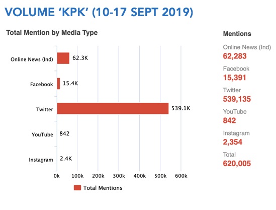 The announcement of the bill on revision of the KPK law on 5 September 2019 led to a flurry of conversations about the issue on social media. While this is natural for any controversial topic, there was a striking peak in the wave of conversations in the week before the bill was ratified, especially on Twitter. A social network analysis (SNA) conducted by Drone Emprit Indonesia shows a sudden spike in the number of tweets in the days leading up to the ratification. In total, more than half a million tweets mentioned KPK in that one week, which is unusually high for one topic.