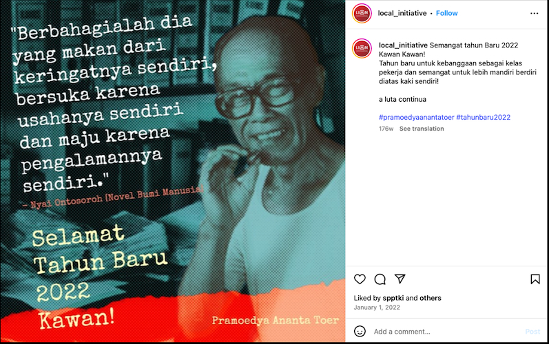 This meme from the Jakarta Loneliness Council came about as a form of resistance to the social pressure to get married. The translation of the quote is, ‘Having a date is nothing special; what makes it great is only the interpretation of it'; altering the famous Pramoedya Ananta Toer quote, ‘Life is simple; what makes it complicated are interpretations of it.’ The photo used in this meme is one of Pram when he was young. This becomes an index of the audience targeted through this meme, namely the younger generation.