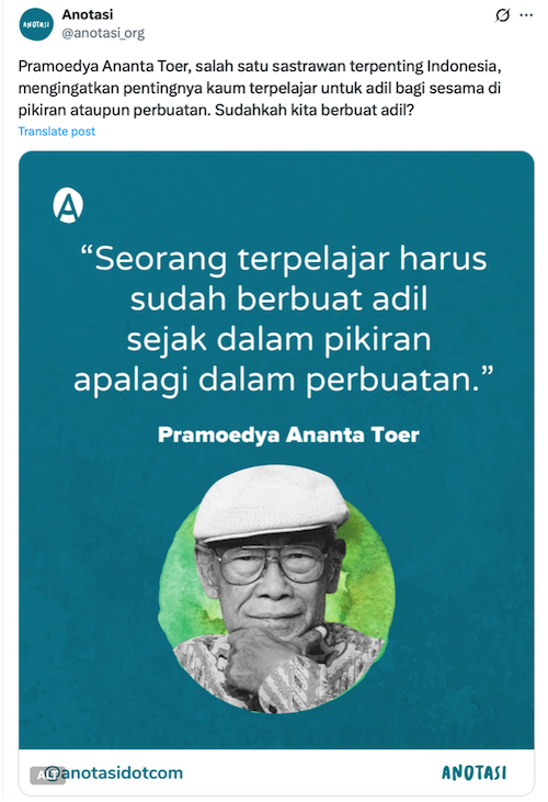 A significant category of Pramoedya Ananta Toer memes feature formal portraits of the author, often accompanied by scholarly captions or quotes taken from his books. Figure 2 was posted in celebration of Pram’s birthday on anotasi.org.