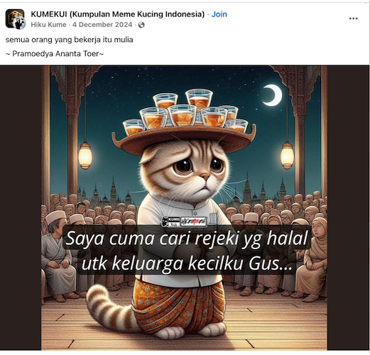 Another notable category of Pramoedya Ananta Toer memes is at times seen in absurd or humorous edits of his images. The signified meanings derived from these satirical memes, such as in Figure 4, often revolve around humour and irony, sometimes offering commentary on contemporary culture through Pramoedya's quotes. This meme can generate amusement and potentially make Pramoedya's quote more approachable to broader audiences. The meme in Figure 4 is a reference to a well-known incident on social media involving a prominent ulama (he is also part of the Presidential staff) and an iced tea seller, in a Muslim sermon. In that sermon the ulama mocked the iced tea seller. The video went viral, the ulama was widely condemned.