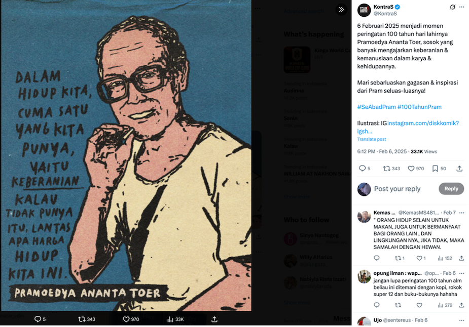 This shows us that digital platforms and internet culture are reshaping the ways in which historical figures are remembered, interpreted, and transmitted. Internet memes serve as a contemporary form of collective memory-making, offering a space for both the reinforcement and subversion of established narratives. While some memes contribute to preserving Pramoedya's intellectual authority, others use humour and satire to recontextualise him for new audiences. Furthermore, his image is actively employed for socio-political commentary, connecting his historical struggles with current issues in Indonesia. The potential for both democratisation and distortion of historical narratives through memes underscores the need for critical engagement with these digital representations. The ‘Seabad Pram’ commemoration in 2025 provides a timely opportunity to further observe and analyse how official memory intersects with the dynamic and evolving landscape of digital folklore surrounding this iconic Indonesian figure.