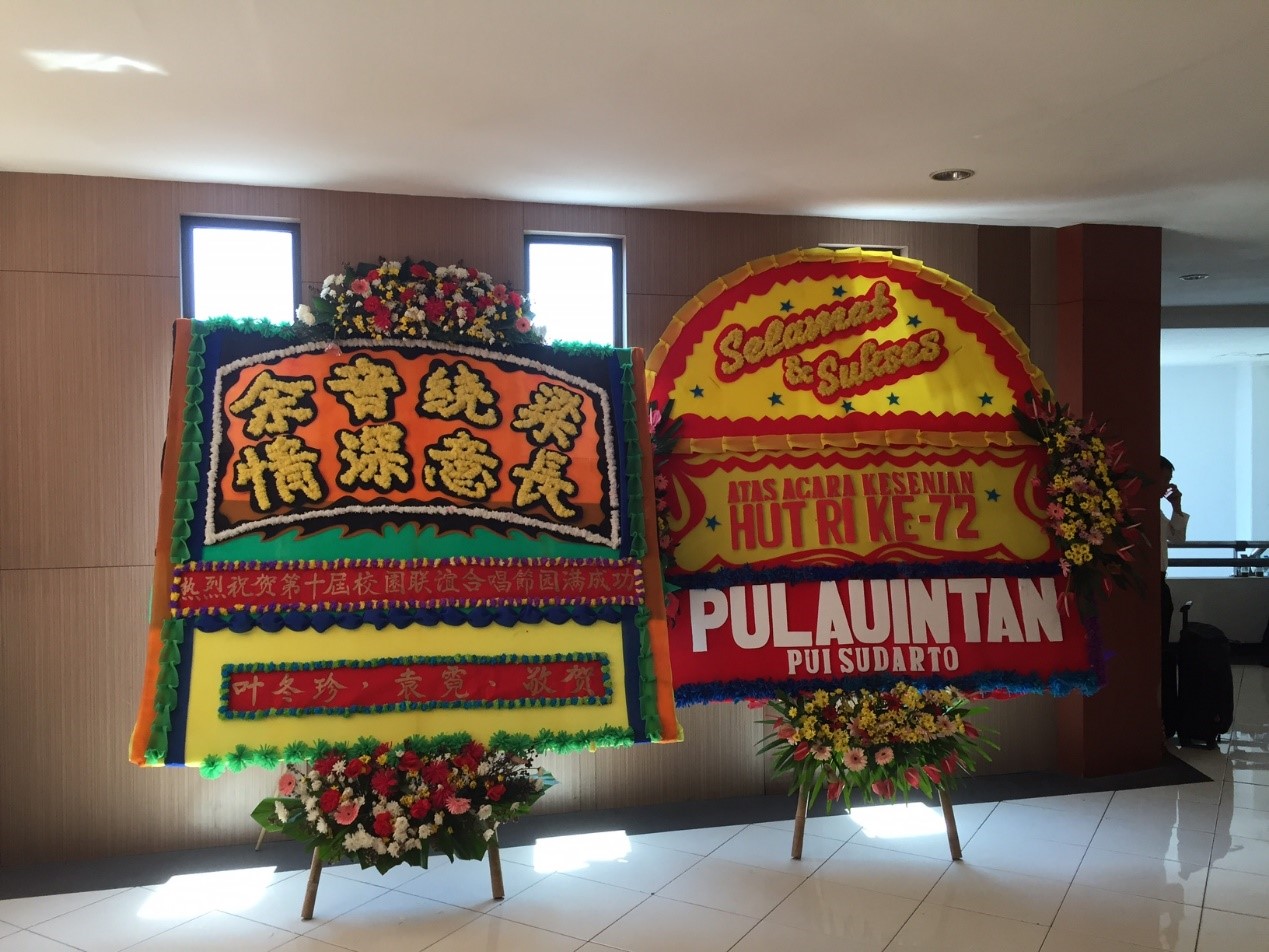 Festivals such as this illustrate the integrated networks of Mandarin-speaking and Chinese-identifying society in Jakarta. Naturally enough, the audience was comprised largely of the families, friends and social circles of the choir members; all but a very few of them Chinese-Indonesian. The venue was itself a major example of Chinese-Indonesian investment in educational institutions. Universitas Bunda Mulia (UBM) is a centre of Mandarin learning in Indonesia, founded by Djoko Susanto, the Chinese-Indonesian owner of Alfamart, one of Indonesia’s largest convenience store chains. UBM features its name in Chinese (慈育大學, or Loving Cultivation University) on its main building, where the festival was held. Its results in China’s international Chinese Bridge competition have also been impressive, and graduates of the program have become news anchors on the Indonesian Mandarin-language channel TV DAAI. A large wreath in the lobby conveyed the well-wishes of local Chinese business people and cultural figures.