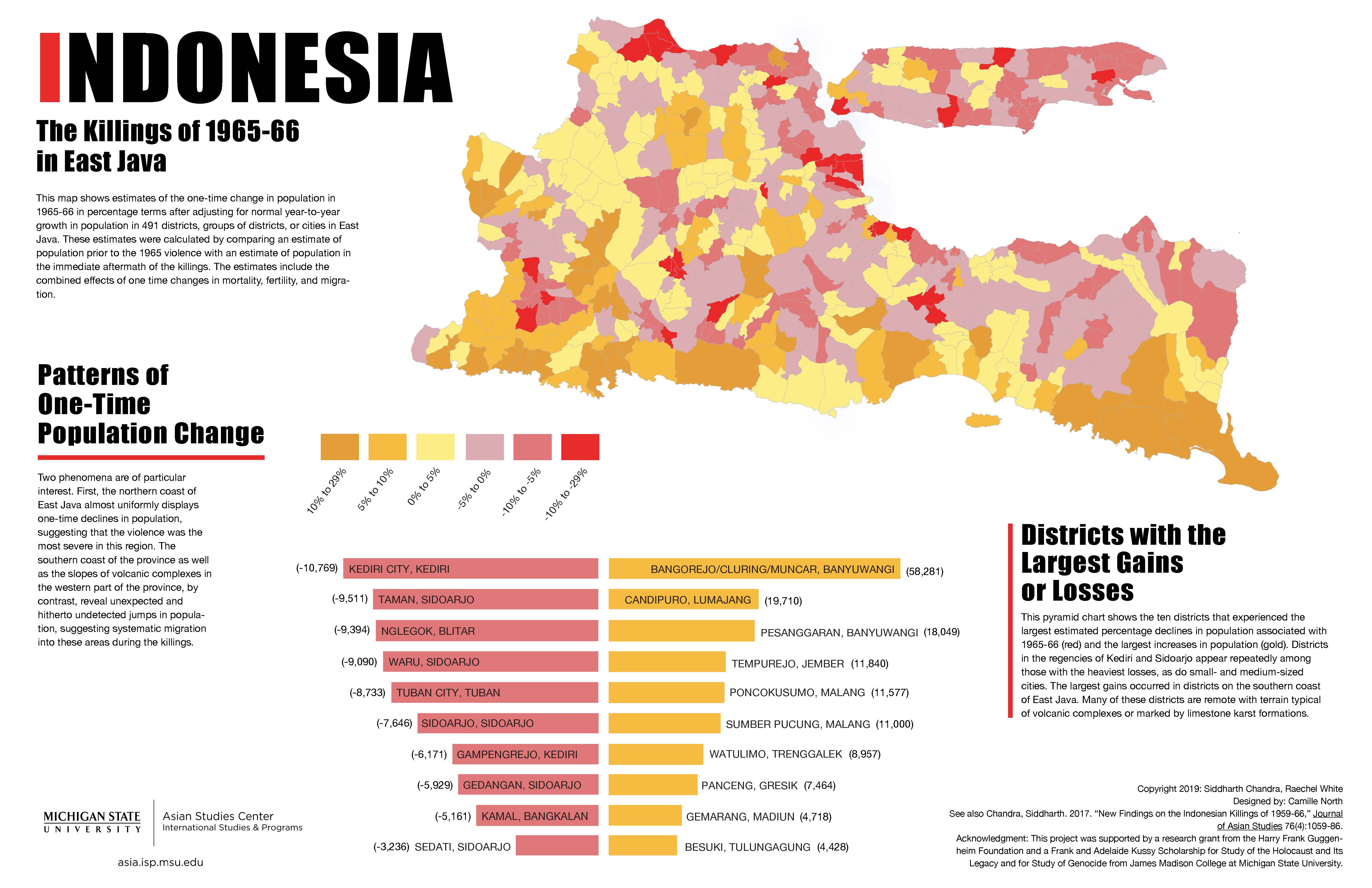 The infographics presented here come with two important caveats. First, the estimates of population change associated with the killings in a few kecamatan (districts) are probably inaccurate because the assumptions underlying the calculations likely do not hold uniformly across all kecamatan.