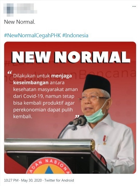 Cyber troops were also tasked with explaining the procedures and benefits of the New Normal. They did so by spreading videos, infographics and memes on Twitter, Instagram and in WhatsApp groups, consistently tagging their posts with one or more of the following hashtags: #TataKehidupanBaru (new life order), #DisiplinPolaHidupBaru (discipline is the new life pattern), #DisiplinKunciNewNormal (‘discipline is the key to the New Normal), #BersamaJagaIndonesia (protecting Indonesia together), #NewNormalCegahPHK (New Normal prevents lay-offs) and #NewNormalPulihkanEkonomi (New Normal recovers the economy). The consistent use of these hashtags ensured uniformity of the message. Furthermore, it tied the argument of economic welfare to the mantra of discipline in observing health protocols, which together created the narrative of a ‘new life order’ – a safe and prosperous order.