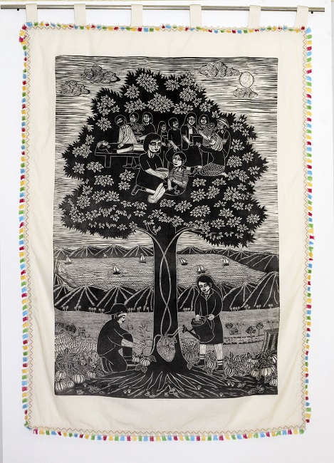 Particularly striking are the mixed media contributions, such as that of Fitri DK, a feminist artist from Yogyakarta: 'Nandur Dulur (Plant Everyone)', a woodcut on calico with embroidery: