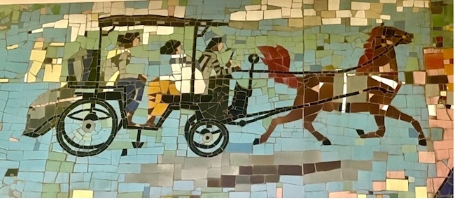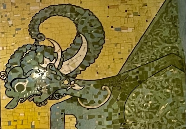 The mosaic is a romanticised portrait of rural Java. Aside from a small image of the 9th century Buddhist monument Borobudur, there are no identifiable places. The images are of healthy and happy young people, most of them women, engaged in the daily activities of village life, farming, preparing food, bullock carts and a village market. A scene of young women bathing in a river may reflect Sukarno’s interest in erotic imagery. The overall simplicity and lack of symbols of conflict and modernity evokes his Marhenist ideology that locates the essence of Indonesia in self-sufficient village communities. It also resonates with the nostalgia many Javanese have for the (alleged) simplicity and tranquility of village life.