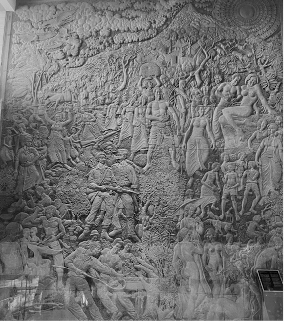 Untung Rugi di Lereng Merapi is stylistically very different from the two mosaics. It is a relief carving similar to those found on the ancient Buddhist and Hindu monuments Borobudur and Prambanan. It also includes elements of socialist realism, the Soviet art style that combined realist technique and idealist representations of life under socialism, or in Sukarno’s case Marhenism. Merapi is the volcano located to the north of Yogyakarta. Villagers living on its slopes are threatened by periodic eruptions the most recent of which was in 2010. Until the 1980s with the proliferation of cars and motorcycles and the resulting air pollution it was clearly visible nearly every day from any place in the city. It also figures prominently in the sacred geography of the Yogyakarta Sultanate. Sunan Merapi is the guardian of the mountain and is believed to prevent lava and pyroclastic flows from reaching the city. It is also the northern terminus of a mystical axis that extends through the kraton and ends at a shrine dedicated to Gusti Kangjeng Ratu Kidul, the Queen of the spirits of the Southern Ocean and spirit wife of the Sultans of Yogyakarta at Parangkusumo on the southern coast.