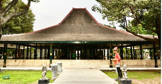 The Royal Ambarrukmo Hotel combines Indonesian and Javanese political symbolism. It is situated on the grounds of the Kedhaton Ambarrukmo a royal residence constructed by Yogyakarta Sultan Hamengkubuwana (HB) VI in 1857. It is a miniature kraton (palace) that includes a pendopo, an open-air pavilion used as an audience hall (Gadri), a formal dining room (Ndalem Ageng), residential quarters, a Mushala or prayer room, and Bale Kambang, a meditation chamber. It was originally used as a politically neutral space for meetings with Dutch officials and foreign dignitaries and for meetings between the Yogyakarta and Surakarta branches of the Mataram royal family. Yogyakarta and Solo both claim to be the legitimate successor of the earlier Kartasura kingdom (1680-1755) and were on barely speaking terms since the mid eighteenth century. Meeting at either kraton presented significant protocol problems. Located on the edge of Yogyakarta on the road leading to Surakarta, Kedhaton Ambarrukmo was a (nearly) neutral space. After abdicating on 29 January 1921, HB VII lived there until his death on 30 December of that year. It was then used for various administrative purposes and gradually fell into disrepair.